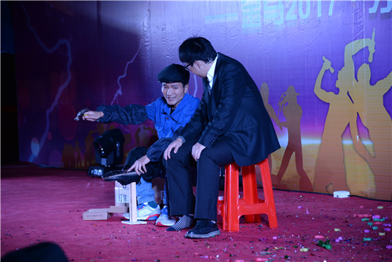 晚會(huì)在當(dāng)日18:30準(zhǔn)時(shí)開始,近300名金馬人有序齊聚臺(tái)下,一卸工作的疲累,放松精神,歡樂暢談,縱享小食。一開始是前期迎春文體系列活動(dòng)的頒獎(jiǎng)表彰環(huán)節(jié),籃球、羽毛球、桌球、乒乓球、越野、攀巖等各項(xiàng)活動(dòng)獲獎(jiǎng)代表分別從頒獎(jiǎng)?lì)I(lǐng)導(dǎo)手中接過獎(jiǎng)狀和獎(jiǎng)金,喜悅之情溢于言表。隨后,文藝匯演正式開始,瞬時(shí)音樂響起,燈光閃爍,全場(chǎng)目光齊刷刷地射向舞臺(tái)。喜慶洋洋的“恭喜發(fā)財(cái)”率先登臺(tái),來自機(jī)械車間的6名員工將濃濃的年味散播至現(xiàn)場(chǎng)每一個(gè)角落;開料車間創(chuàng)意策劃編排的“大王叫我來巡山”舞蹈完美融合生肖吉祥物寓意,打造出一個(gè)“眾猴拱雞”的趣味舞臺(tái);來自玻璃鋼車間王曉玲的一首“映山紅”以其游刃有余的高聲調(diào)震撼全場(chǎng);精益部的“ 鞋釘”小品雖僅2人登臺(tái),卻憑借生動(dòng)形象的人物塑造與演出征服了臺(tái)下評(píng)委與觀眾... ...匯演中場(chǎng)雖時(shí)有毛毛細(xì)雨拂起,但像雨像霧又像風(fēng)的感覺為演出現(xiàn)場(chǎng)平添了一絲韻味,增添了一份浪漫的氣息,整場(chǎng)表演更是可謂精彩紛呈、引人入勝。