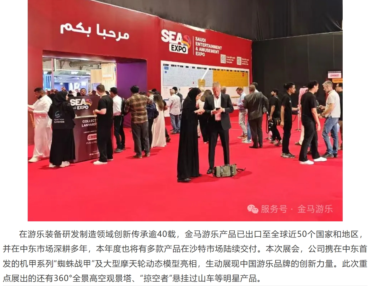 5月20日,全球游樂行業(yè)焦點之一的2025 SEA沙特展在沙特利雅得前沿會展中心盛大開幕。隨著“沙特2030愿景”加速推進(jìn),中東文旅產(chǎn)業(yè)將迎來黃金發(fā)展期。金馬游樂搶抓市場機(jī)遇,攜高品質(zhì)創(chuàng)新產(chǎn)品與全球服務(wù)方案閃耀亮相本次展會,與全球伙伴共拓中東千億級市場新機(jī)遇!
