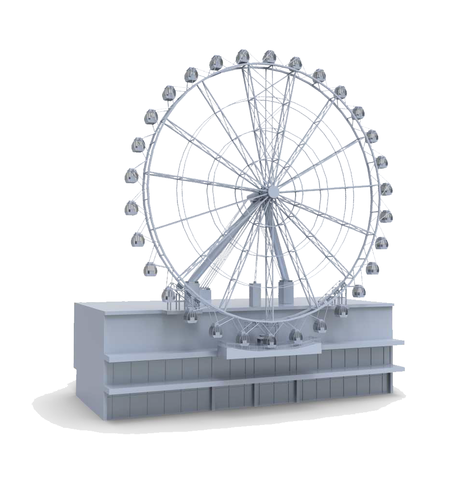 GLC-52A觀覽?,懸挑式?柱設(shè)計,如倫敦眼般彰顯“飄逸”個性。其懸挑式?柱設(shè)計尤為適合樓頂觀光,30個配備?全的吊廂使快速運營成為可能。