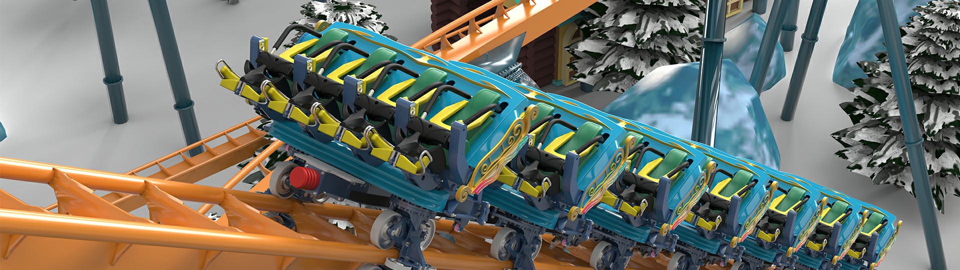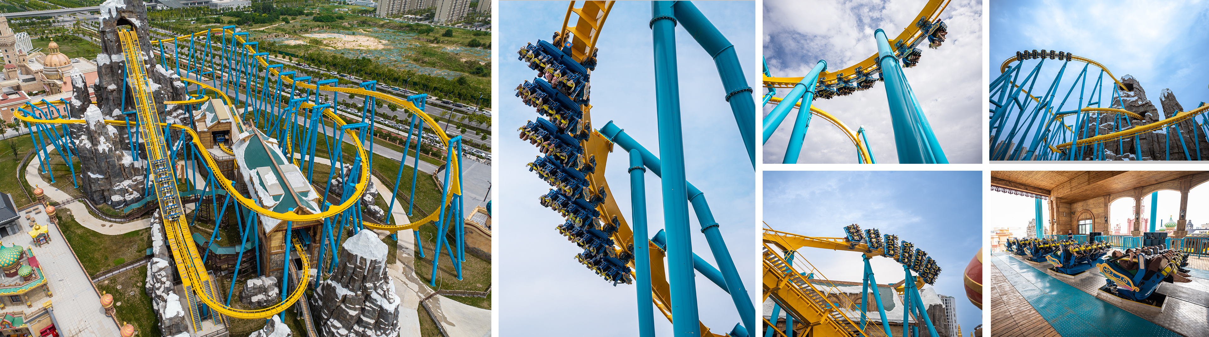 飛行姿態(tài)乘坐式過山車。軌道元素含括急速俯沖飛行、大俯沖飛行、卷餅形倒栽環(huán)、水平環(huán)等,滑行中乘客在軌面仰姿和軌下俯姿兩種姿態(tài)間連續(xù)切換,領(lǐng)略高空翱翔的刺激。與以往的飛行過山車不同,此款飛行過山車車體位于軌道上方,配合水平面上下客平臺,改善了乘客臥姿上下的不適與不便,有效提升舒適度與運(yùn)營效率。